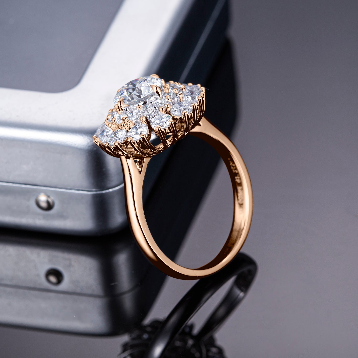 Step into a world of enchantment with our exquisite 1.3 carat round lab-grown diamond blooming halo engagement ring, elegantly set in opulent 14k rose gold. This extraordinary piece is a true work of art, where the allure of a blooming floral design meets the timeless elegance of a round diamond, creating a masterpiece that beautifully embodies your love's unique radiance. At the heart of this enchanting ring lies a magnificent 1-carat round lab-grown diamond, a true embodiment of brilliance and fire. Grown with meticulous precision and ethical responsibility, this lab-grown gem mirrors the qualities of a natural diamond while reflecting your commitment to sustainable choices. The blooming halo setting, thoughtfully crafted in lustrous 14k rose gold, adds an exquisite touch of opulence to this remarkable piece. It gracefully surrounds the 1-carat center stone, forming not one, but two glorious rings of round lab-grown diamonds, totaling 0.3 carats. This design creates a captivating effect that mimics the delicate petals of a blossoming flower, symbolizing your love's growth and beauty. This engagement ring is more than just a declaration of love; it's an embodiment of your unique connection and a promise of an endlessly radiant future together. The fusion of a blooming floral design with the captivating sparkle of a round diamond results in a design that is as exceptional as your love story. With the 1.3 carat round lab-grown diamond blooming halo engagement ring in 14k rose gold, you're not just celebrating your love—you're making a statement about your values and your commitment to a sustainable future. Choose this ring to embark on a journey of love and style that is as extraordinary as it is responsible. Elevate your engagement with a symbol of elegance, unity, and conscious choices, a true blooming testament to your love's enduring beauty.