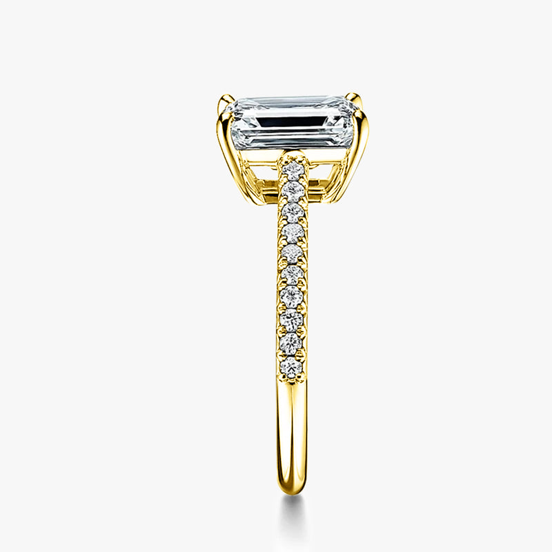 At the heart of this ring, a mesmerizing 2-carat emerald-cut lab-grown diamond takes center stage, radiating unparalleled beauty and grace. The emerald-cut diamond's soft, romantic silhouette and exceptional brilliance perfectly represent the comfort and sparkle of your love story. With each glance, it reflects the warmth and radiance of your relationship, capturing the essence of your bond.