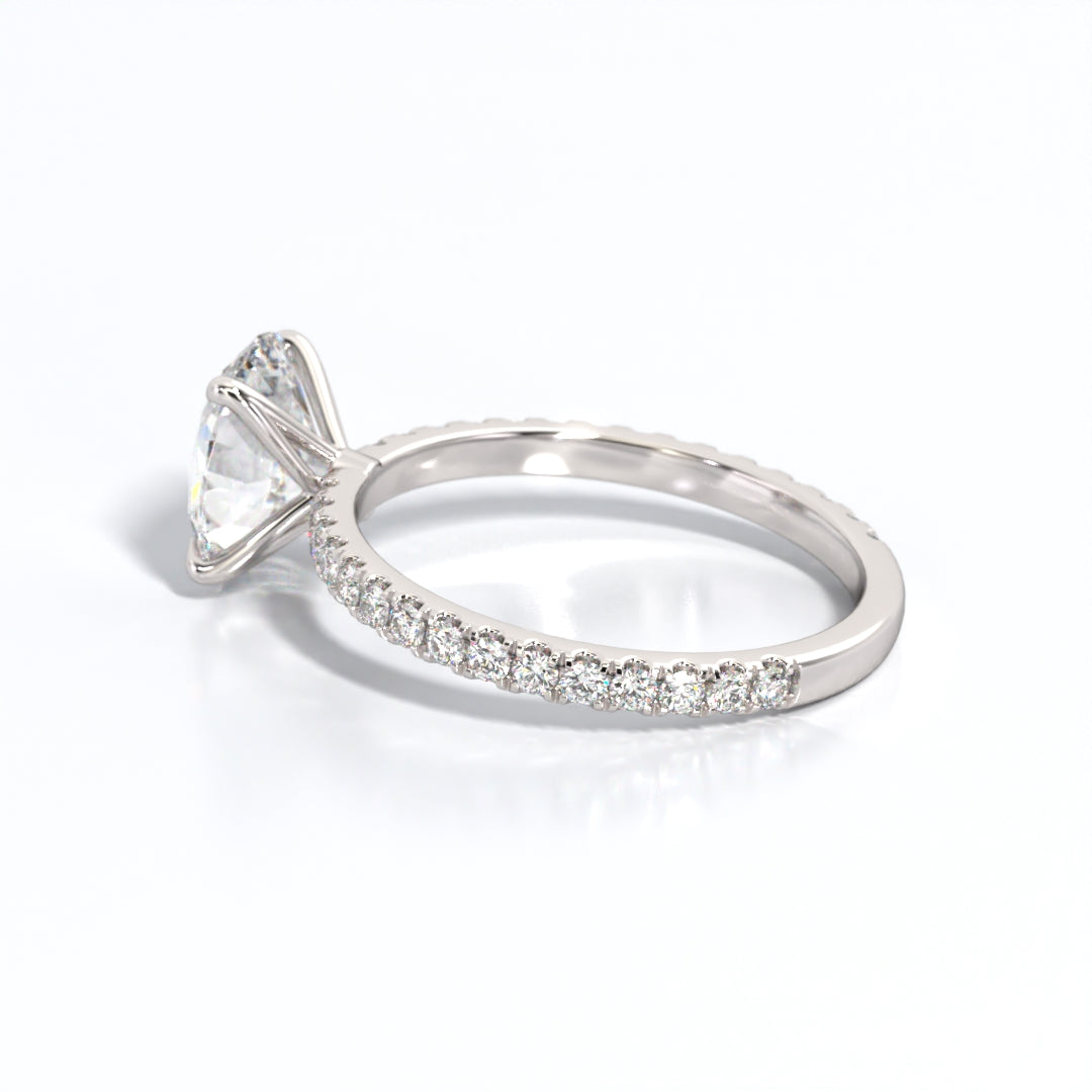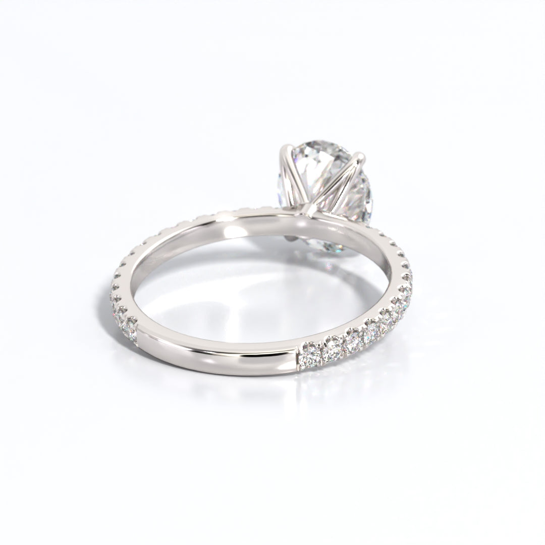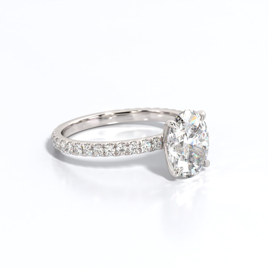 This engagement ring set is a true testament to classic elegance and timeless beauty. At its core lies a magnificent oval-cut lab-grown diamond, boasting a total weight of 2.5 carats. The oval shape, known for its graceful symmetry and elongated silhouette, is a symbol of everlasting love and grace, making it the perfect choice for those who appreciate timeless sophistication. This lab-grown diamond exhibits exceptional clarity, brilliance, and charm, embodying the radiance of your love.