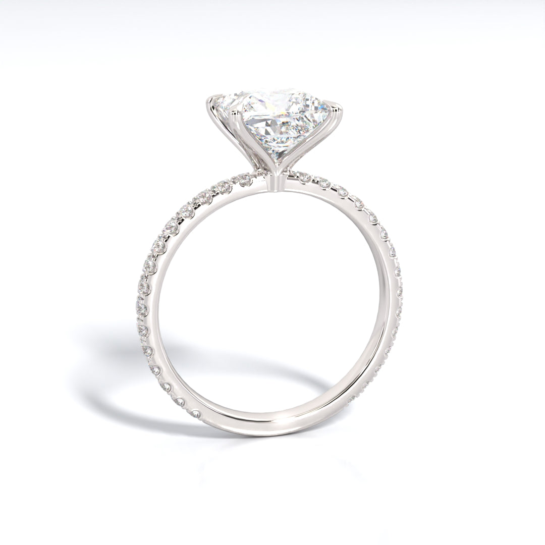 This engagement ring set embodies the perfect fusion of modern elegance and timeless beauty. At its heart, a remarkable princess-cut lab-grown diamond takes center stage, boasting a total weight of 2.5 carats. The princess cut is renowned for its sharp angles and sparkling facets, symbolizing the strength and brilliance of your love. This lab-grown diamond is a masterpiece of precision, showcasing exceptional clarity, sparkle, and charm, reflecting the radiant nature of your love.