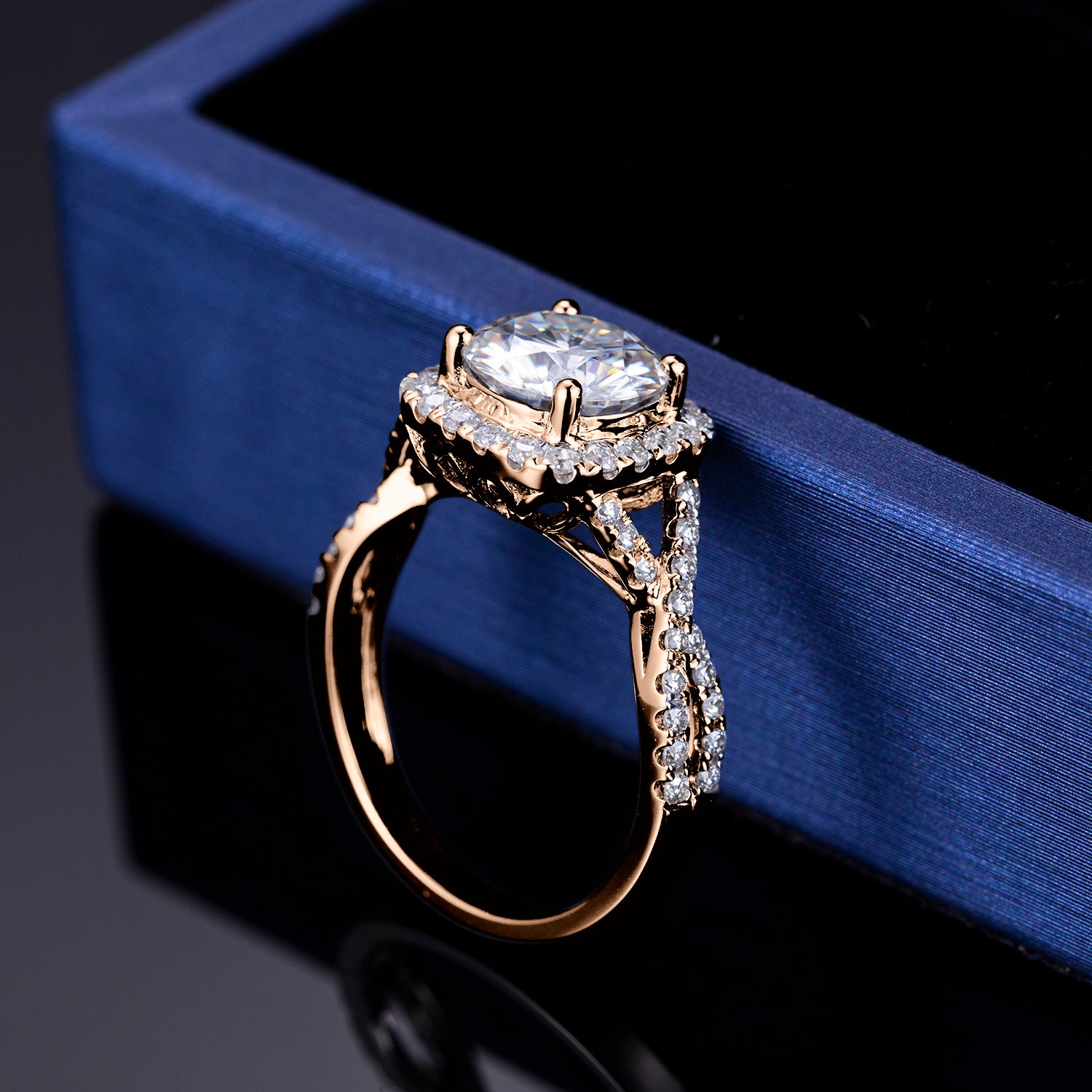 Prepare to be captivated by the brilliance and elegance of our extraordinary 2.5 carat round lab-grown diamond twist halo engagement ring, gracefully set in luxurious 14k rose gold. This remarkable piece combines the timeless beauty of a 2-carat center stone with a mesmerizing twisting halo and additional diamonds cascading down the band, creating a masterpiece that beautifully symbolizes your unique love story. At the heart of this enchanting ring lies a magnificent 2-carat round lab-grown diamond—a true embodiment of unparalleled brilliance and fire. Grown with meticulous precision and ethical integrity, this lab-grown gem possesses all the characteristics of a natural diamond while reflecting your commitment to sustainable choices. The twist halo setting, thoughtfully crafted in lustrous 14k rose gold, adds a touch of opulence to this exceptional piece. It gracefully surrounds the 2-carat center stone, forming a captivating twisting halo that enhances the diamond's beauty. An additional 0.5 carats of round lab-grown diamonds cascade down the band, completing the design with radiant brilliance and depth. This engagement ring is more than just a declaration of love; it's an embodiment of your unique connection and a promise of an endlessly radiant future together. The fusion of a twisting halo design with the captivating sparkle of a 2-carat center stone results in a design that is as exceptional as your love story. With the 2.5 carat round lab-grown diamond twist halo engagement ring in 14k rose gold, you're not just celebrating your love—you're making a profound statement about your values and your unwavering commitment to a sustainable future. Choose this ring to embark on a journey of love and style that is as extraordinary as it is responsible. Elevate your engagement with a symbol of elegance, unity, and conscious choices, a true testament to your love's enduring beauty.