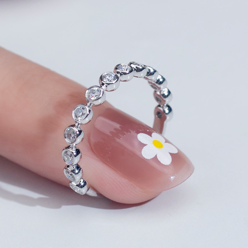 At the heart of this wedding band lies a continuous row of brilliant round lab-grown diamonds, each securely nestled within a bezel setting. These diamonds are hand-selected for their exceptional quality and brilliance, symbolizing the precious moments you'll create as a couple. With each glance, they remind you of the love and connection you share.